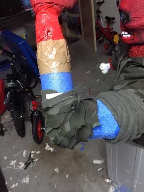 Luego añadí los brazos. Até los brazos a las juntas. El brazo completo fue hecho de dos piezas de PVC conectado con una combinación de ángulo recto. Se ha añadido cuerpo al brazo completo con tallarines de piscina más que formé con el bisturí.