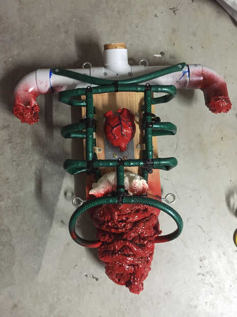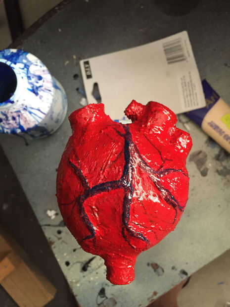 Lo siento, que no tomo fotos de como hice el corazón, pero esto es lo que hice. Empecé con un corazón en forma de estrés de juguete, entonces corté un agujero en el centro y empujado en un envase de la medicina, trataba de mantener el libro de registro. En la tapa para el recipiente pegué un imán por lo que el corazón podría unir a la hoja de metal en la cavidad torácica. Luego consiguió un montón de tapas de diferentes tamaño pluma y empujado en el juguete de la tensión como tubos. Luego envuelve la cosa del agujero con vendaje y había pintado con cemento de PVC. Hice las venas con una pistola de pegamento caliente y luego había pintado.