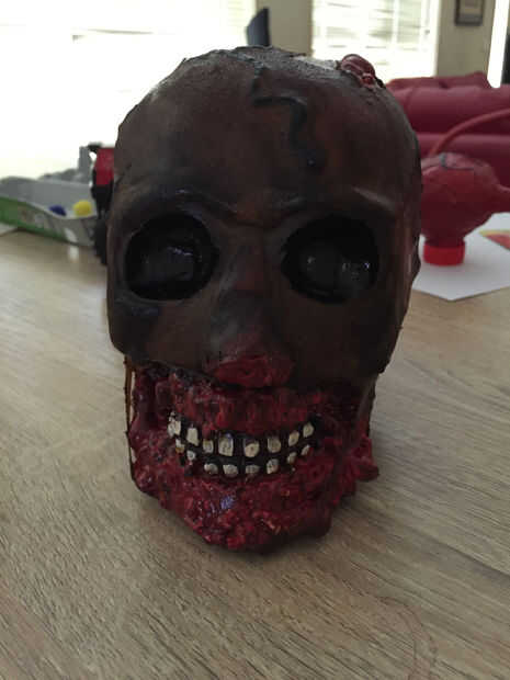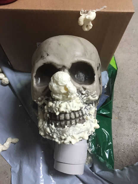 Para la cabeza utilicé un cráneo de plástico barato. Yo Atornille una tapa de PVC para la parte inferior por lo que se podría sujetar al cuello. He añadido luego expansión espuma donde quería gore. Acariciando a la espuma, el aire se escapa por lo que no ampliar demasiado. También utilicé la espuma para moldear una nariz. Dolía el cráneo, agregó pantimedias para la piel a continuación, había pintado otra vez.