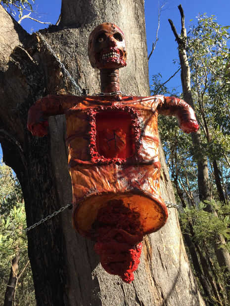 Para el efecto final pegué unos ojos de muñecas antiguas en los zócalos del ojo. Luego encontré un lugar oculto, profundo en el bosque y un árbol grande agradable para colgar el geocaché. Usé la cadena y los ojos del tornillo en la madera para colgar en el árbol. Era muy robusto y viene el corazón es fácil de acceder y extraer.