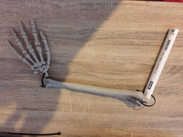 Para hacer los brazos y las piernas, quería movible. Tenía un producto llamado un 'Bag'o' huesos que compré en una tienda baratito para $7 último Halloween. Esta bolsa contiene unos cuantos al azar huesos, manos, pies y un cráneo. Como producto final iba a tener la ropa en él, hice los brazos y las piernas medio tubo de PVC y hueso la mitad del apoyo. Para las uniones me perforó agujeros en cada extremo y había conectado cada pieza con una sujeción de cable.