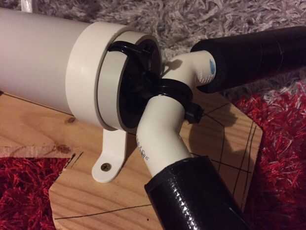 Para colocar las piernas, hice una pieza en forma de v de PVC tubería y 135 grados se une. La idea original era poner esto para el tablero del forro con soportes. Pero, después de lo que me decidí a ir para más flexibilidad así que taladrar dos agujeros en la parte inferior de la columna central y había colgado de las piernas de ella con sujetacables. Usé un tubo de PVC para la parte superior de las piernas.