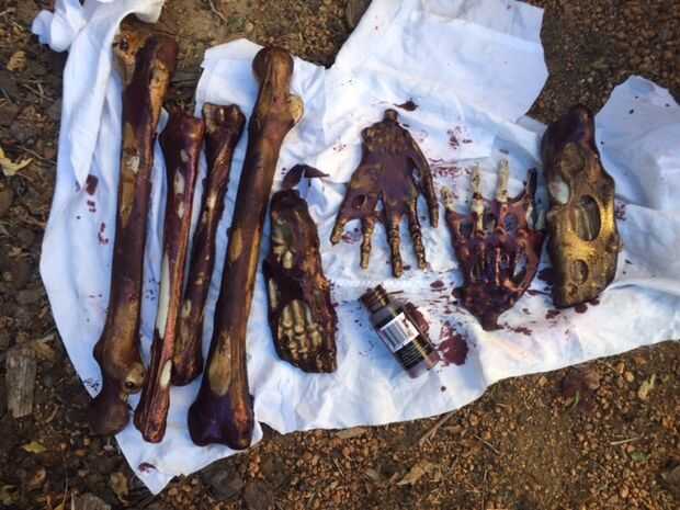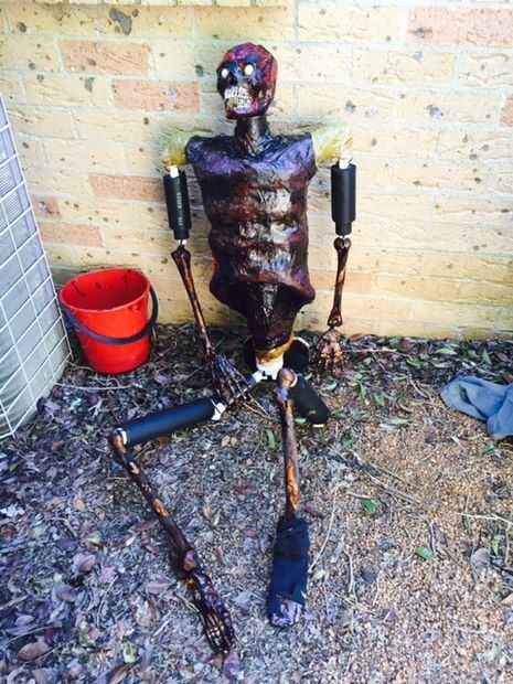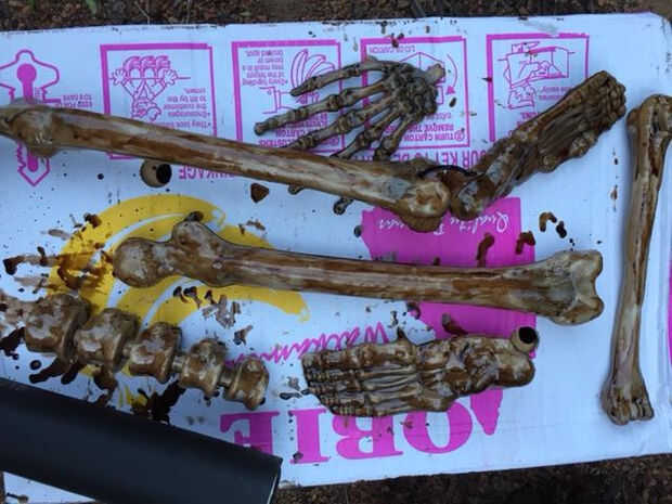 Me sorprendió lo bien los huesos miraban con solo la mancha de la nuez. Una vez que añadí las pantimedias pintó las pantimedias con cemento para PVC claro y esperando que se seque. Hice lo mismo con el cráneo, salvo que el cráneo tenía ya un aspecto marrón me salté la mancha de la nuez.