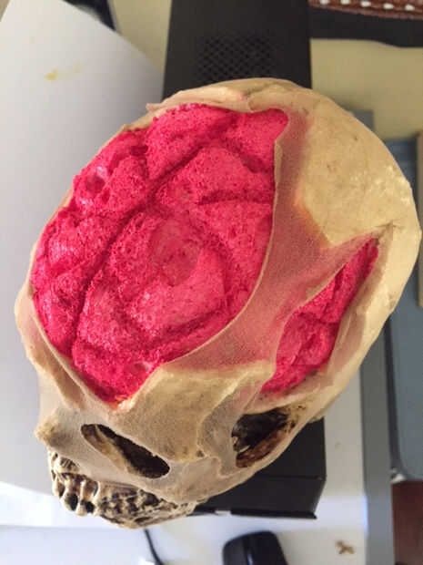 Luego retocadas las áreas de hueso expuesto con otra capa de tinte de nogal. También había manchada la zona del cerebro en el cráneo y le dio unos arroja a chorros de pintura en aerosol rojo para darle un aspecto de la herida abierta. Para agregar ojos compré un par de bolas de la polilla de madera que encajan perfectamente. He pintado blanco y fijo en su lugar utilizando epoxy.