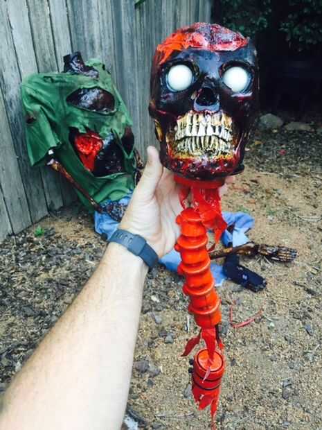 Mientras que esto fue hecho como un geocache, mi idea era que tiraría por la cabeza sacar la columna vertebral, algunos Organos y del contenedor de caché. A la base del cráneo enrosca una tapa de PVC que montado sobre el tubo central de PVC. Esto significó la cabeza se siente en el cuello y no caer. Pinté la tapa negra en la parte superior y rojo en la parte inferior. Entonces atornillado un gancho en la parte inferior del cráneo para colgar los interiores en.