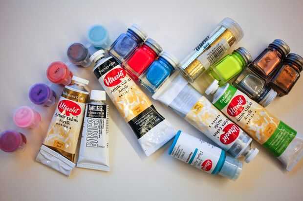 Hemos tenido todo tipo de pintura en un cajón con la etiqueta 'pintura y esas cosas' - fue divertido a cepillar en todas las diversas clases de colores y esmaltes para ver cómo se veía. Los esmaltes más delgados dejaron una mancha brillante, mientras que el acrílico secada con un brillo más opaco acabado.