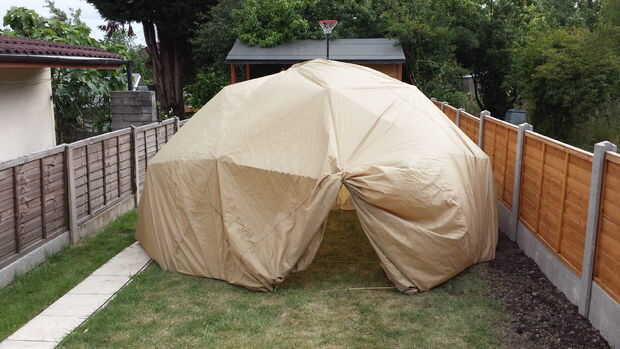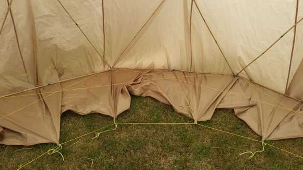 Me las arreglé para conseguir una sábana vieja mosca para un tipi roto y en el momento en que me funciona aunque podría probar y refinar la forma en el futuro (uno un genio en una máquina de coser me avisan) sólo escondido debajo y atado un anillo de cable a través de la clavija puntos y tiró todo firmemente. Entonces pesaron con algunas bolsas de agua para detenerlo en el viento.