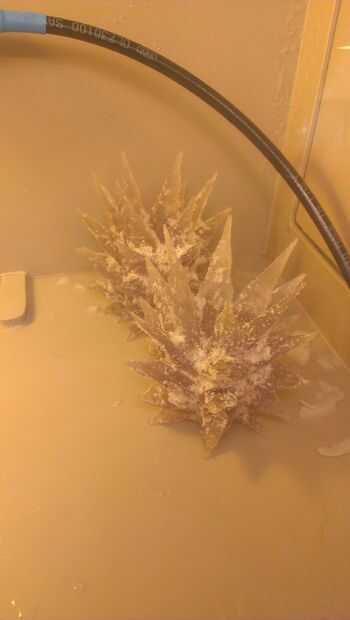 Al seleccionar nuestros favoritos (Noah y yo), transforma por exagerar la altura y mantener el ancho y la profundidad de la misma. Lo imprimí en un tamaño mayor de 6" de profundidad y ancho y 8" de altura en el 500 de Stratasys en modo de impresión de detalle (resolución de 30 micrones) utilizando Vero claro compuesto. La imágenes muestran la letra en la cama de la impresora (tomó 20 horas), quitar a la mesa de limpieza, en el agua a alta presión y limpiar completamente reluciente en la luz del sol.
