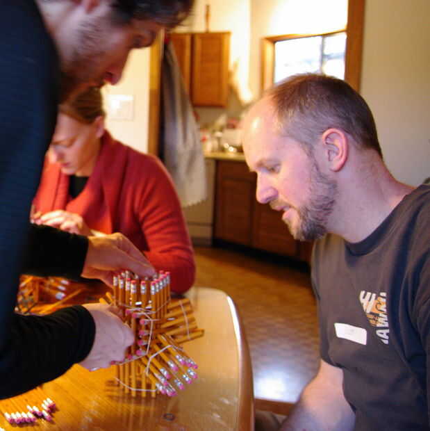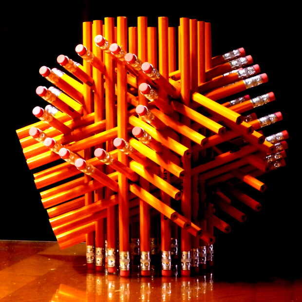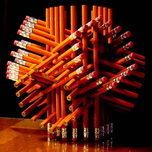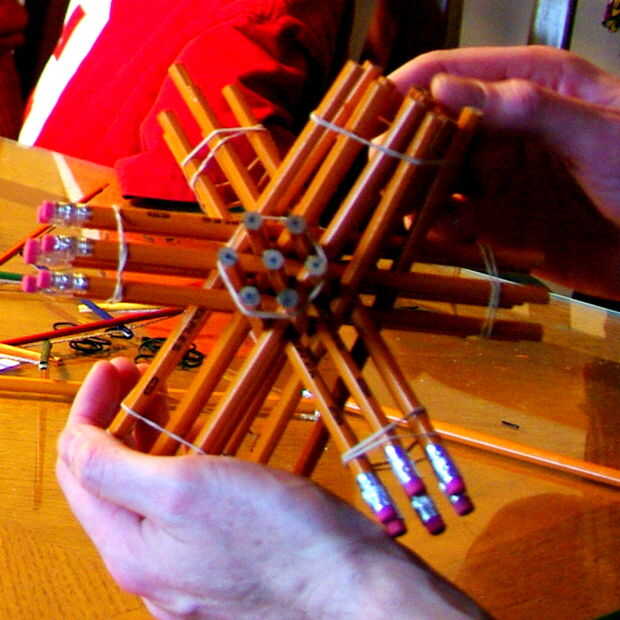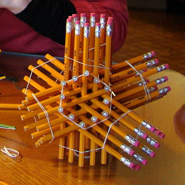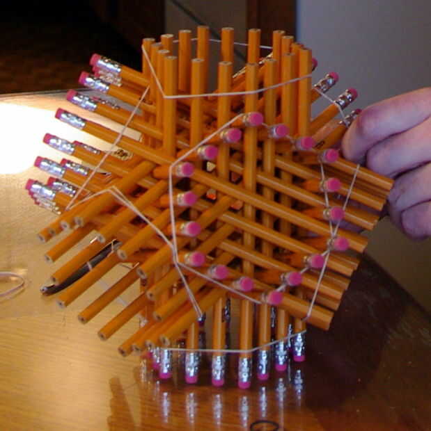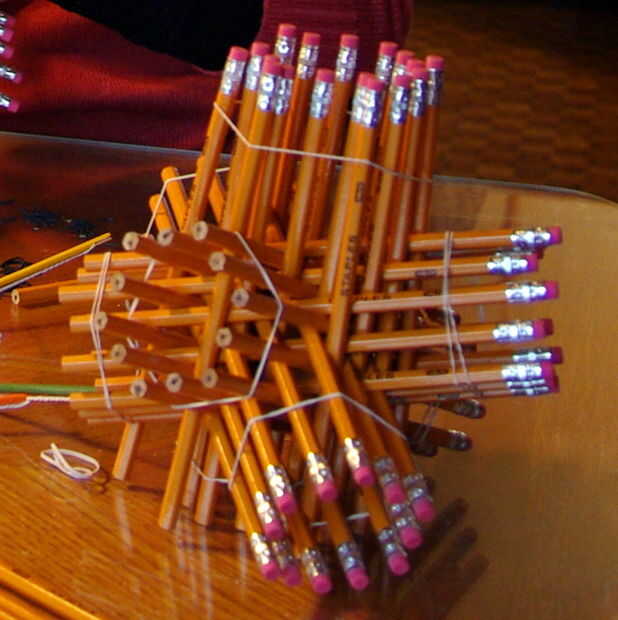 Video: siga las instrucciones de Alejandro, pero construir sólo en cuanto a un hexágono que consiste en un anillo de 18 lápices, quitando los lápices interiores como vas. Si encuentras que los borradores no arreglan tetrahedrally (como yo), sólo invierta un lápiz de un anillo en un momento hasta que su escultura se parece a la original. Pegamento las uniones antes de retirar las bandas de goma.