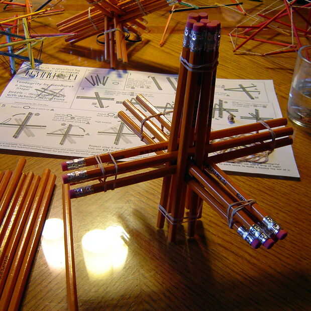 George W. Hart es un escultor de formas geométricas constructivas (y escritor de las columnas de matemáticas lunes a hacer), y durante mucho tiempo he sido un admirador de su obra. Reproducción de su arte está lejos de ser trivial - una vez intentó construir su Infundíbulo Chronosynclastic, pero se rompió tantos CDs renunció en indignación. Sin embargo, recientemente descubrí que Alejandro Erickson, mathemagician instructable r y confeso, vive en la misma ciudad que yo y ejecuta talleres en construcción geométrica, por lo que lo contrató para pasar la tarde. Fue el gurú de gran geometría que esperábamos que sería, y mantuvo los 6 niños y 3 adultos bien entretenido y ocupado haciendo tensegridades. Como una petición especial, él también enseñó dos de nosotros hacer una réplica de la escultura de 72 lápices de Hart (Hart hizo una edición limitada de 19 ejemplares únicos de estos). Tomó un par de horas tranquilamente y pegamento y con la supervisión fue sorprendentemente fácil de hacer. Puede ser montado bajo costo usando lápices (convenientemente se vende en packs de 72!), unas gomas y un poco pegamento, en casi exactamente la misma manera que Alejandro hace sus esculturas Hexastix (véase abajo para el vídeo). La sección representativa hexagonal de los lápices hacen un ajuste muy natural para esta forma geométrica, como son los agujeros en el enrejado hexagonal. Los borradores se arreglan tetrahedrally con respecto a uno otro; el volumen encerrado por los lápices es un dodecaedro rómbico. Es una cuidada obra de arte que me complace propia; Muchas gracias a George W. Hart por la inspiración y Alejandro para la instrucción.