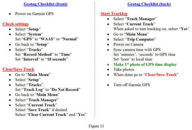 Figura 11 es una lista de Geotag que he creado para mi GPS que llevo en mi bolso de la cámara. Aunque está diseñado para el Garmin Oregon 450, puede ser fácilmente adaptado a otras unidades GPS. La línea punteada indica dónde doblar la lista de verificación. Una vez dobla entonces laminado como dos caras tarjeta.