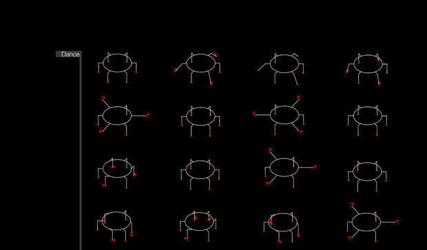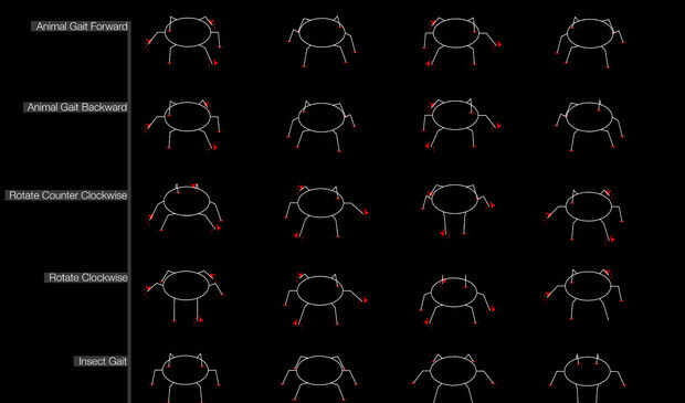 Una vez en saltamontes, los controles son codificadas por color: púrpura es para dimensiones de Geoweaver, blanco es para los comandos de a pie, amarillo es para el control de Arduino los componentes y el azul es para los comandos de impresión. Asegúrese de que el número de puerto de Arudino es correcto. Los comandos de a pie utilizan el componente de "Contador" de Firefly para introducir a números en las piernas. Una de las partes inicialmente confusas puede ser que para "encender" el algoritmo de a pie debe establecer el botón booleano "Carrera a pie/gira" en False, no es cierto. Incluido en el archivo es una versión animada de Geoweaver que permite simular y probar los patrones de movimiento antes de empezar a correr servos con él.