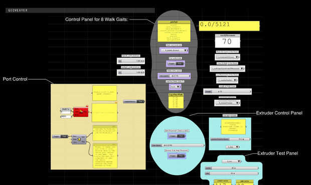 La parte más difícil del proyecto es cómo controlar Geoweaver al caminar y la impresión. Pasamos mucho tiempo en la investigación del movimiento, y hasta ahora Geoweaver puede caminar en línea recta, una línea curva, gira, danza, de e imprime al caminar. Este hexápodo ha sido diseñado para ser controlado por un Arduino Uno tomar comandos directamente de Firefly, un plug-in para el software de CAD 3D Rhinoceros. Firefly fue creada por nuestro profesor, Jason Kelly Johnson. Rhino es $995, sin embargo, usted puede descargar una versión de él
