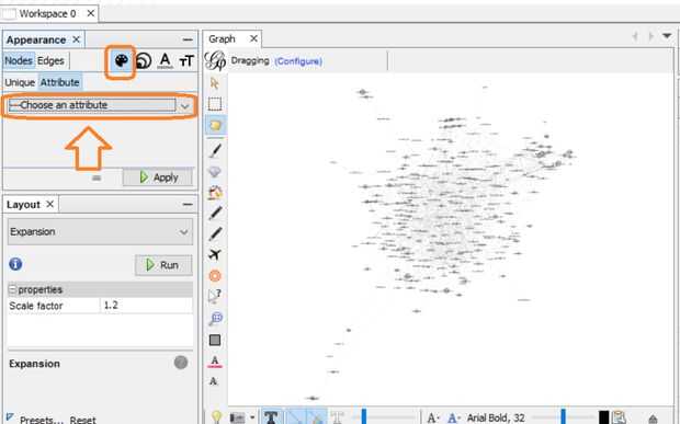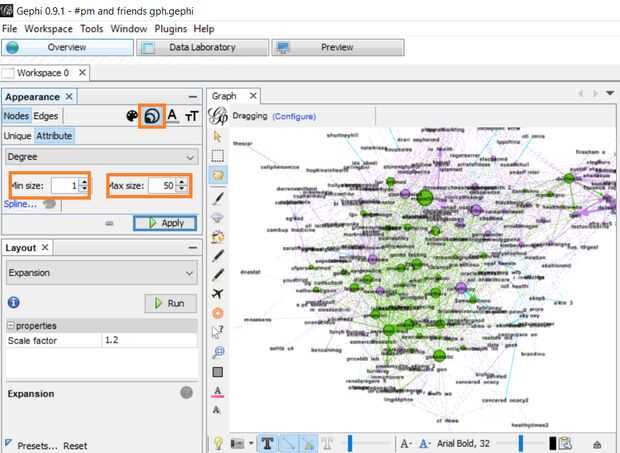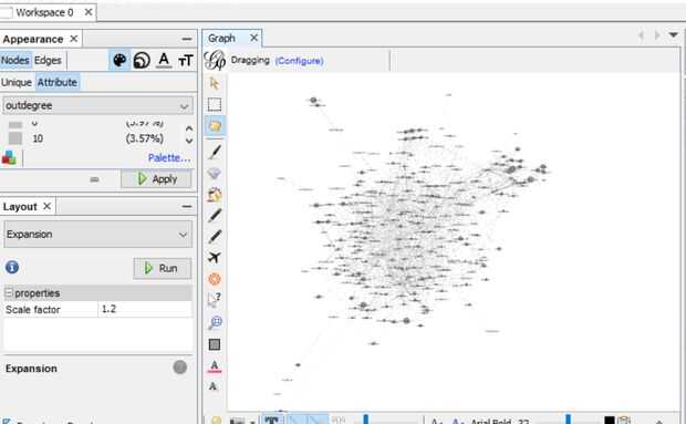 Después de ejecutar fuerza Atlas2, ejecute expansión para empujar los nodos tan distantes como usted quisiera. Esto hará que la lectura de los datos más fácil. Los datos deben verse como figura 2.
