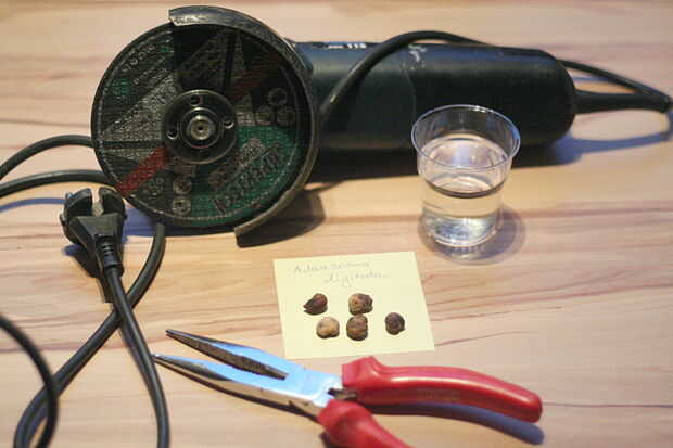 Rednecks locales Andrej, Katarina y Matjaz hacen uso aquí de una amoladora angular, alicates y un vaso de agua, para escarificar las semillas y lograr cerca de 100% de germinación (20 de 20 hasta ahora).