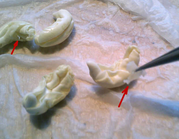 Si usted puede hacer tan suavemente, uso de pinzas para quitar algunos de los flojos "material de embalaje" entre los pliegues de las hojas (ver segunda foto) porque tienden a atrapar el agua líquida y son un riesgo potencial para la putrefacción. No seas demasiado fuerte aunque - rompiendo la plantita en medio es mucho más perjudicial. :)