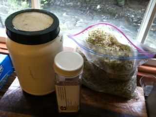 Darse cuenta no tengo cualquier recipiente lo suficientemente grande y los brotes es necesario un poco de sol a 'verde' me fui al fiel ziplock. Se trata de una bolsa de congelador de 1 galón muy lleno de brotes! Fue 12 doble puñados de brotes. Dejé la bolsa cerca de sol indirecto y demanda para arriba muy bien.