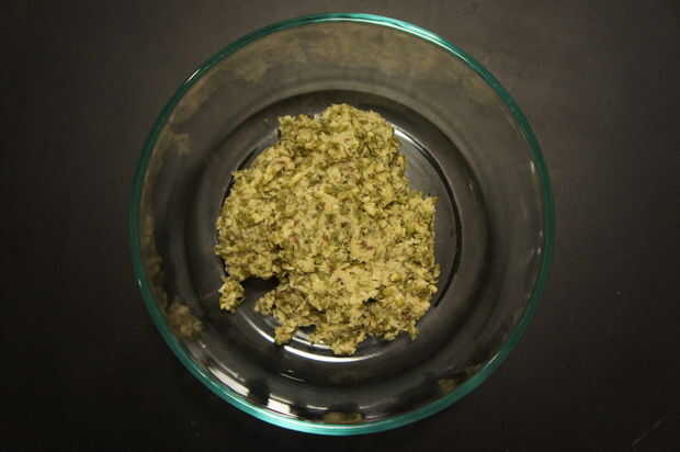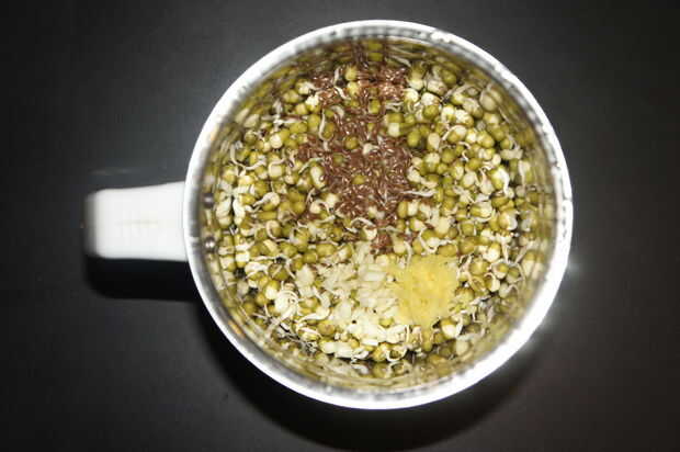 1) moler el grano germinado de Moong junto con semillas tostadas de lino, el jengibre y el ajo agregando muy poca agua (2-3 cucharaditas) y convirtiéndola en una pasta gruesa.