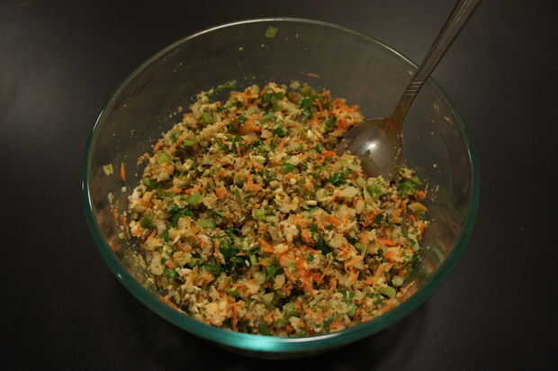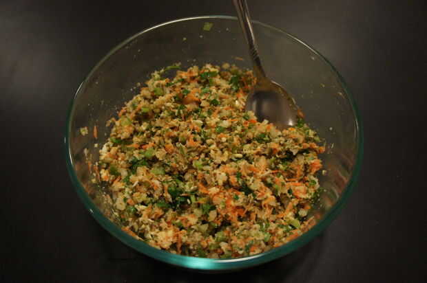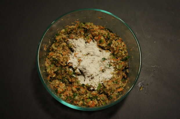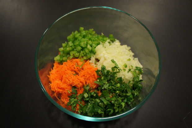 2) a la pasta anterior añadir las zanahorias, pimiento, cebolla, cilantro y harina de maíz.