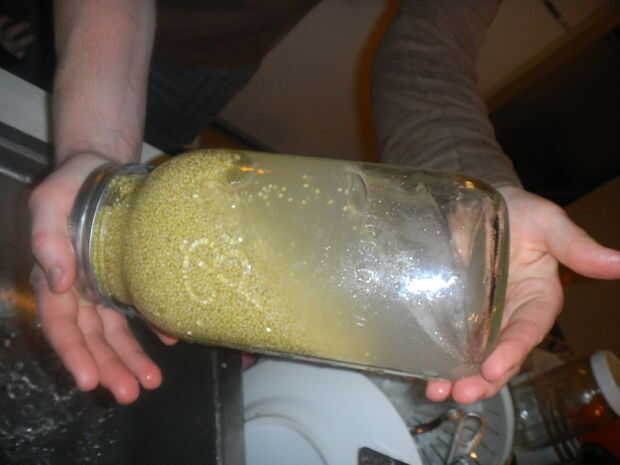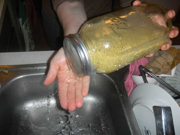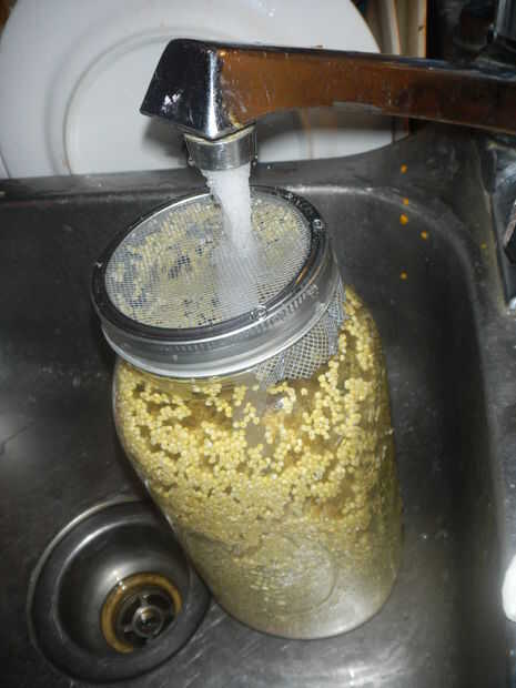 Cada 8 horas (o en la mañana y noche para aquellos de nosotros que comienzan en la noche) Llene la jarra con agua para enjuagar el grano, vacío y apuntalar para secar.