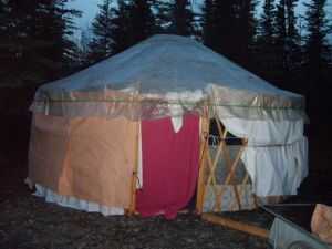 Gers pueden ser construido de palos, cuerdas, cuerda y material. Los palillos pueden ser delgados... los postes de pared pueden ser pocos... diseño de mongol es tan genio que no un palo o poste lleva la carga sí mismo... la carga descansa sobre una cuerda de tensión, uniformemente distribuida en el círculo. Las paredes no necesitan ser incluso en altura todos los postes de la azotea no es necesario colocar cada pie o incluso dos, y la cubierta puede ser capas de lonas más pequeños, no tienen que ser cosidos o pegados. las paredes pueden ser desde viejos manteles a mantas. No es necesario basarse en una agradable terraza con vista a una hermosa vista panorámica. Puede ser en el suelo, sobre una plataforma, o puede ser construido en la cima de un rascacielos de la ciudad (sería algo?) Encontrar la tierra disponible es el mayor desafío para el propietario de la yurta se rompió, pero desde yurtas son fácilmente portátiles se puede mover cada 2 semanas según reglas temporada Parque nacional.