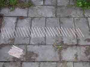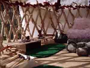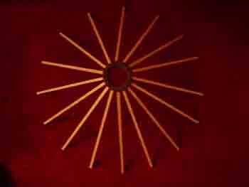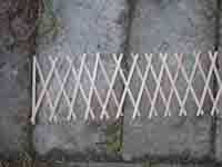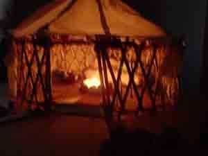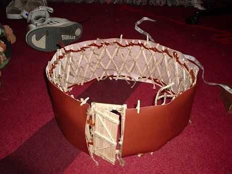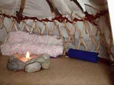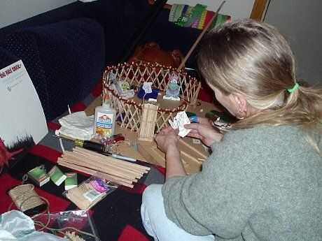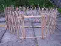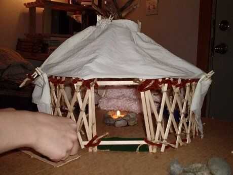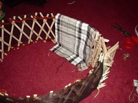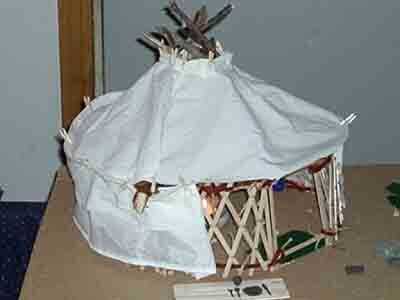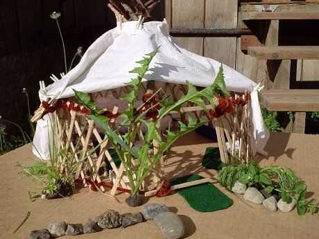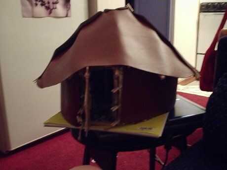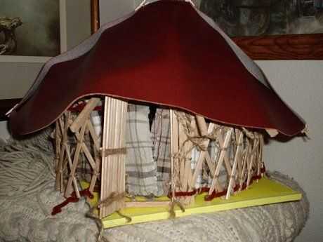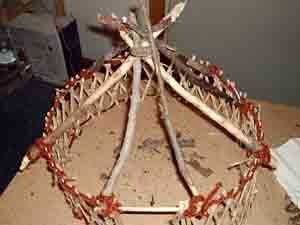 Gertee poco pasó por varios cambios de materiales. Al principio probé con palos atados para las vigas del techo (como en el diseño de tipi) y cambiado que a una pieza de barro moldeado y secado con un montón de palos de la tienda comprado. Que utilizar limpiapipas como el alambre de tensión en las paredes y había atado los listones de la pared de paletas de tamaño junto con pedazos cortos de guita.