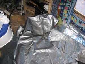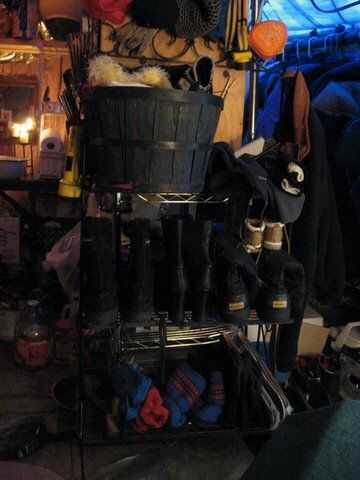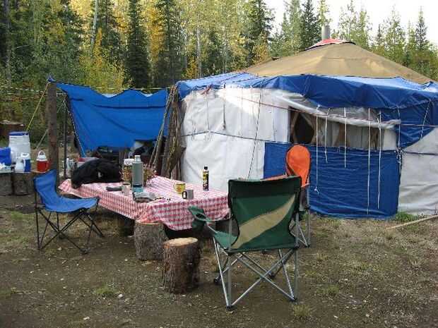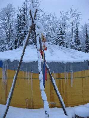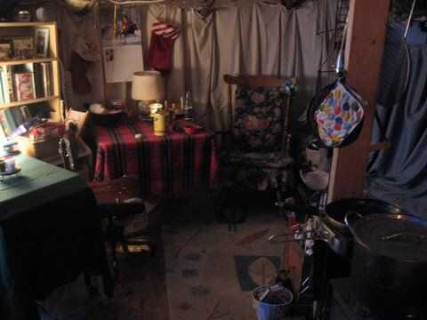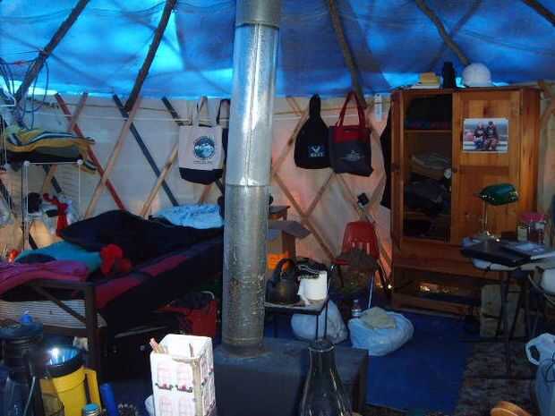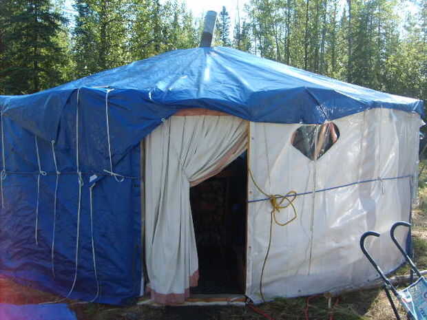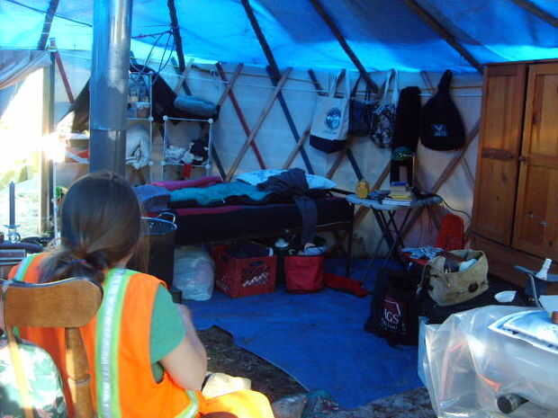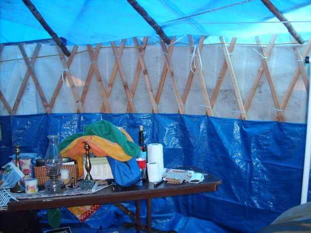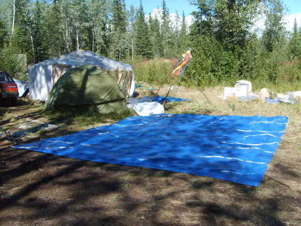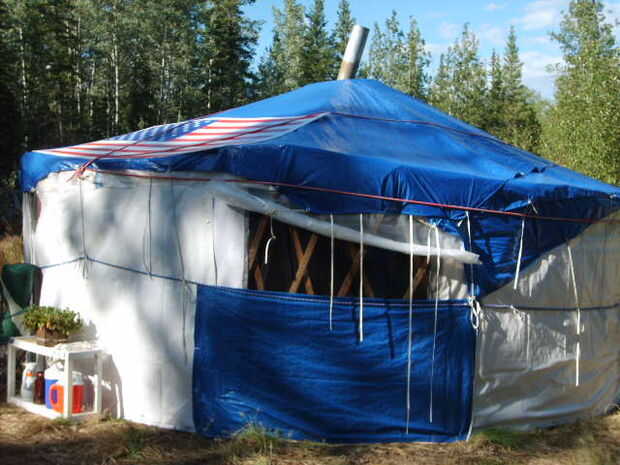 Las ventanas de plástico sólo funcionó hasta aproximadamente octubre cuando llegó a ser necesario cubrir el exterior todo con otra capa de lana. Esto fue cubierto por un pedazo largo de PVC amarillo que encontré en ebay. Mi mayor error fue cuando puse la brillante (impermeable) hacia el interior porque no me gustó la forma en que veía. Duh. Tenía hojas de corte de lana que salió de las prensas gigantes los usos militares a manteles y láminas de hierro--también es incombustible.