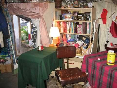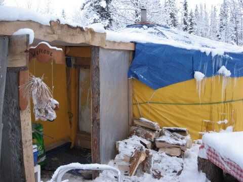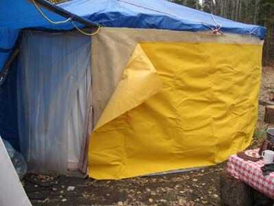 Construí la entrada ártica de madera losa que compré para la leña y una hoja de madera contrachapada de 4 x 8'. Hice un sunporch cubierta con una bolsa de basura transparente pesada y había cubierta la espalda con el lienzo de pared del PVC amarillo sobra.
