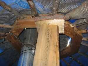 Como los meses avanzaba y volvió más frío, he añadido más y más capas. Construí una puerta de una ventana y algunos 2x4s y listones sobrantes de la pared. Todas mis preocupaciones acerca de los listones de la pared no está conectados correctamente y la inclinación desigual de todo el edificio resultó infundados el ger se refiere. También se utiliza techo cortan postes para que un ger de 16 pies hacer un pie de página 18. Esto aplana mi techo fuera un poco, así que añadido un poste de soporte del techo en el lado caído.