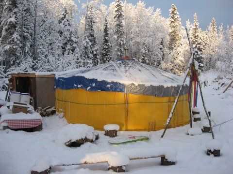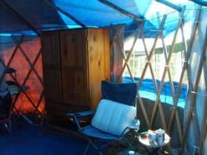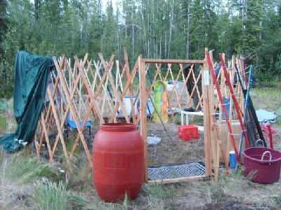 Un ger 18 pies es un gran tamaño porque el piso funciona perfectamente con 6-4 x 8 hojas de madera contrachapada. Sólo las esquinas deben ser cortada en 4 de las hojas. Volcó los cortes y los colocó en cada esquina. Esto utiliza la madera y sólo deja una abertura parcial en 4 lados de la planta, sobre un pie de ancho en el centro y afinándose hasta unas pocas pulgadas en cada extremo. Llena en el espacio de la puerta de entrada con rocas y grava y cubierto con pedazos de la pesada lona plata corté para cubrir una parte del techo. Nunca terminé de las otras tres secciones todavía.