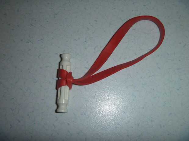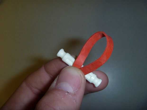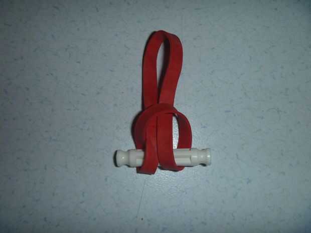 Colocar la goma en el centro de la varilla con nudo de alondra - Envuelva la venda alrededor de la palanca y tire de un extremo a través del bucle que hace que la banda. Tensar la goma elástica.