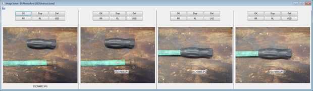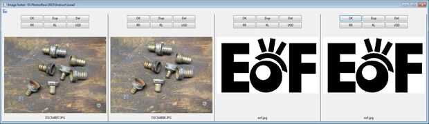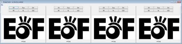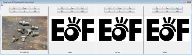 Image_edit.py ejecución usted debe obtener una pantalla como la primera de ellas se muestra en la imagen. EF está parado para el final de la película, lo que significa que no es más fotos para mostrar, eso es porque usted necesita abrir un directorio, esto se hace con el primer icono en la barra de herramientas. Cuando se utiliza debe obtener una pantalla como la anterior segunda. Deben mostrar todos los archivos jpg en el directorio, se ordenan por nombre de archivo que normalmente es la misma fecha (si venían de una cámara). Imágenes duplicadas se muestran generalmente en proximidad cercana. Generalmente "borrar" los pobres obviamente primero. (no se borran realmente, se mueven a un subdirectorio llamado ""). Foto clasificado como duplicados también se mueven (subdirectorio llamado). Cada imagen se "procesa" las imágenes Deslice hacia la izquierda y una nueva foto es traída a la vista. Pulse Aceptar cuando haya determinado la mejor imagen. Como una conveniencia he añadido 3 botones para rotación de imagen (la imagen rotada se coloca en el directorio original, el original en un subdirectorio llamado ""). Sólo trabajar a través de todas las imágenes hasta que aparezca "EF" para todas las imágenes. Las fotos "buenas" están en el directorio original, otros en varios subdirectorios. Puede procesar el directorio una y otra vez si deseas afinar tu selección. Puede deshacer las operaciones moviendo hacia atrás los archivos de los subdirectorios.