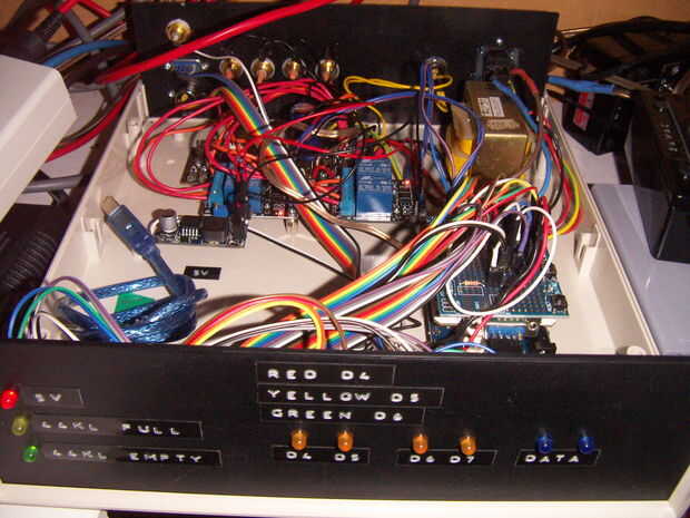 Dentro de la caja es un gran lío-o-los cables. Buscar el cable del jefe de dupont en ebay. Macho a la hembra hacer trabajos más pero a veces a hembra y macho a macho son útiles. Arduino protoboards son también muy útiles, y algunos cuentan con filas de 5V y 0V encabezados (macho y hembra) por lo que las cosas se pueden conectar juntos en un montón de maneras diferentes.
