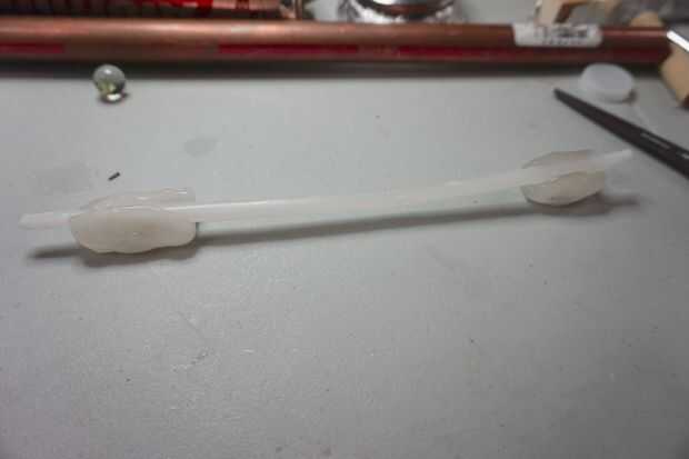 Una vez que este tema en la nevera, poner en un ángulo significa que el dangly matracas son propensos a deslizarse. Para contrarrestar esto, pongo una pequeña cantidad de pegamento en la parte superior los cables en la barra.