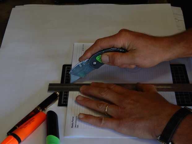 Utilice una cuchilla afilada y una regla de acero para cortar las páginas por la mitad para crear dos planificadores semanales de cada uno.