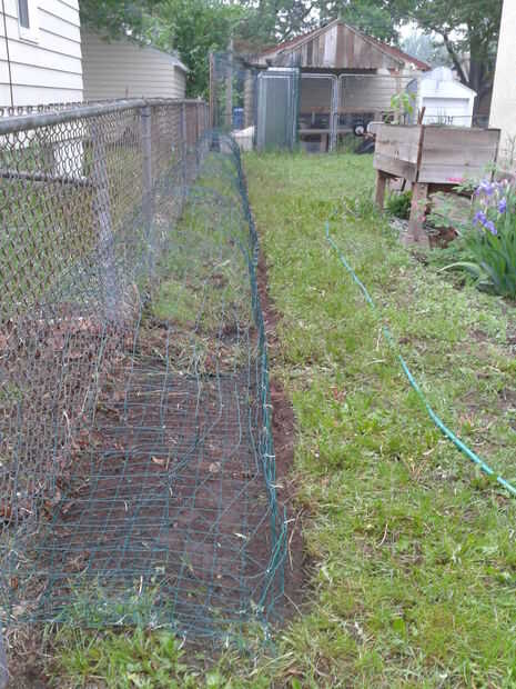 7) cortar 5" tiras de alambre para sujetar el verde cercado a la cerca del acoplamiento de cadena (aproximadamente 3' para arriba) de cada pie, más o menos