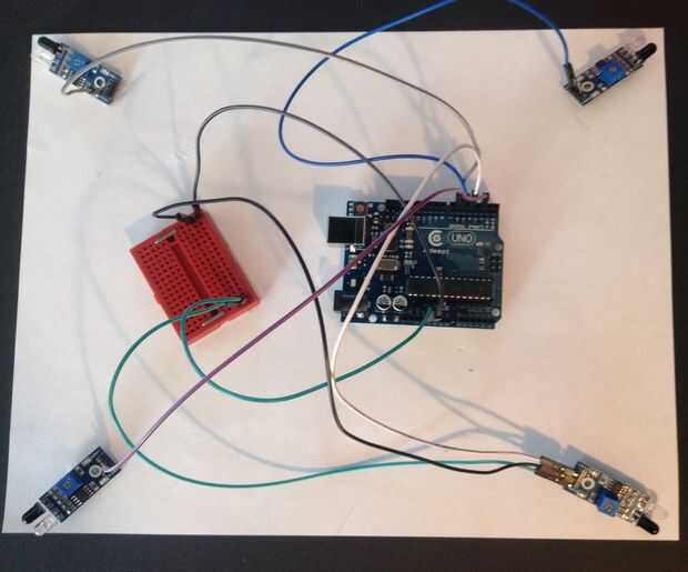Las clavijas en la parte inferior de cada uno de estos sensores son la etiqueta: el eje derecho (VCC) se conecta a la clavija de 5 voltios de Arduino (mediante el mini-protoboard); el pasador central va a la GRD Uno (otra vez, a través de la placa); y el eje izquierdo (a) está conectada a uno de los pines de entrada digitales en el Arduino. En aras de la claridad, completamente he conectado solamente un sensor en la foto que lo acompaña. Usted necesitará añadir los alambres de los 3 otros sensor GRD pernos en el lado izquierdo de la mini- protoboard y de los restantes pines VCC sensor a la derecha de la placa.