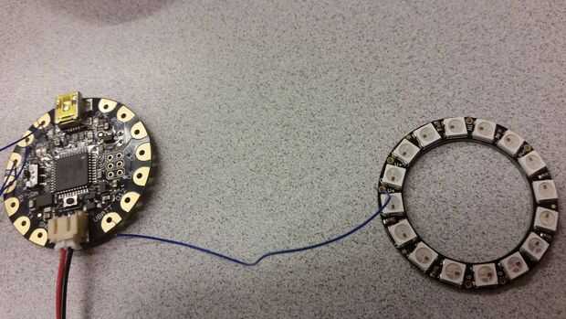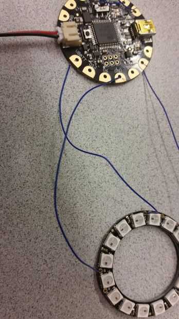 i. siguiendo el esquema del circuito mostrado arriba, pase el alambre de 30 calibre a través del anillo del pixel al microcontrolador (es decir, entrada de anillo conectado a D10 conexión del regulador, tierra a tierra y tensión de anillo a tensión de la fuente de la batería del controlador VBATT).