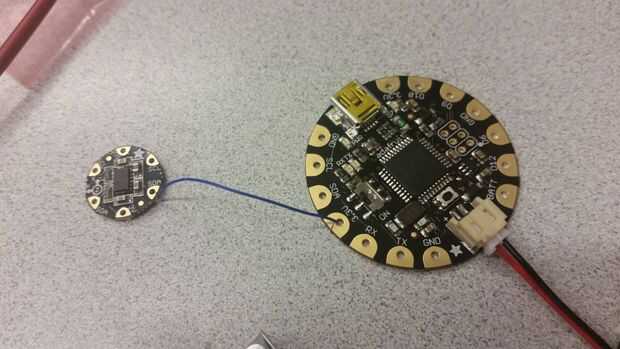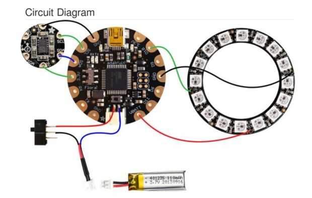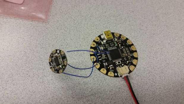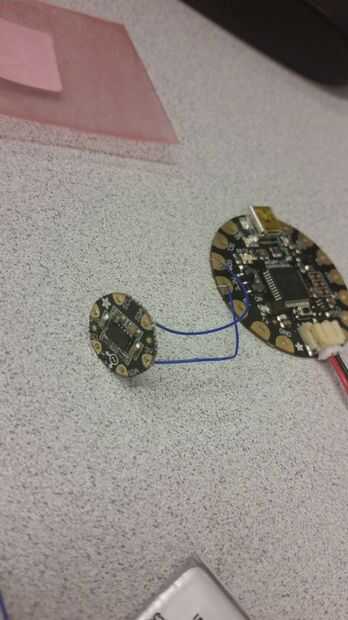 i. Pase el cable a través de las conexiones apropiadas (tierra a tierra, scl a scl), 3V a 3.3V y SDA a SDA del acelerómetro y situarlo en la banda. Referencia el diagrama del circuito por encima de las conexiones correctas.