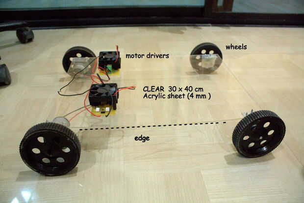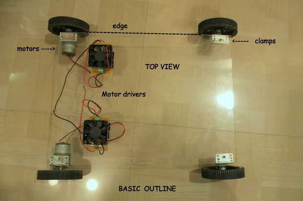 El chasis principal se hace con una pieza de 30 x 40 cm de la hoja de acrílico claro de 4mm. Tiras de acrílico adicionales se fijan en los bordes para fortalecer el cuerpo.