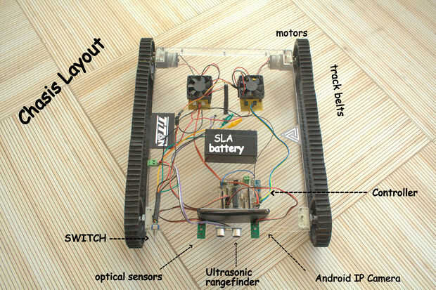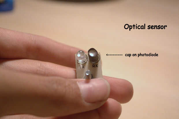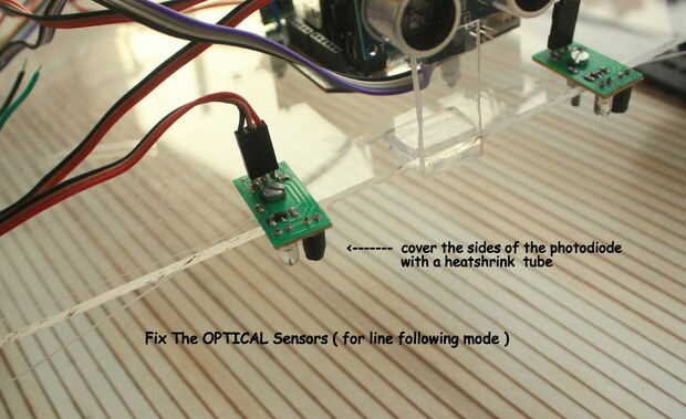 He unido dos sensores ópticos que utilizan un LED rojo ultrabrillante un fotodiodo como Tx como Rx, el fotodiodo está cubierto con un tubo abierto de tubo del encogimiento del calor 6 mm. Esto se hace para evitar lectura falsa, los sensores se fijan hacia abajo para convertirlo en una línea que sigue el robot.