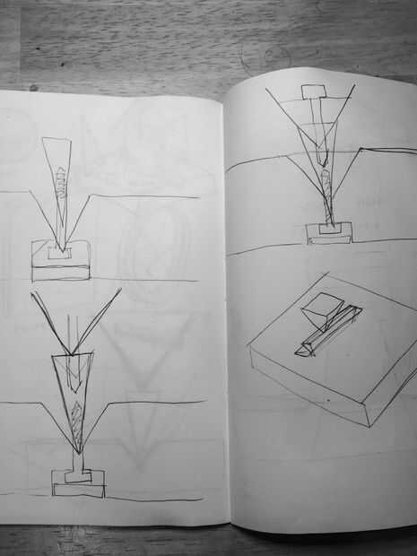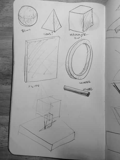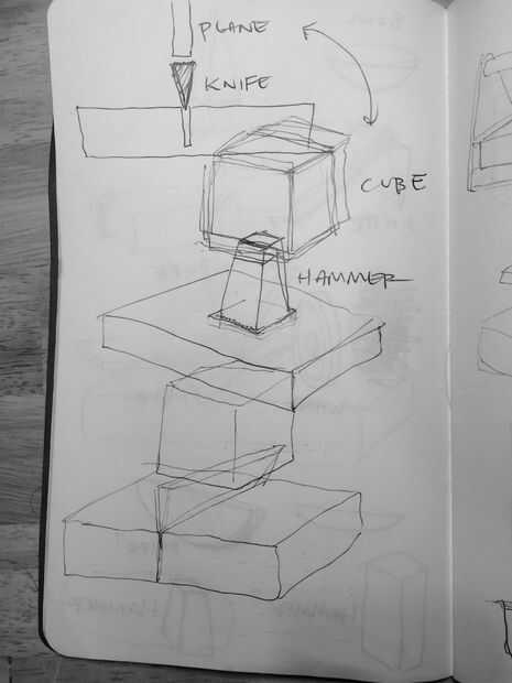 El martillo es una herramienta de la fabricación, centrado en el peso que se avecina del cubo sobre la pirámide. Quería crear un sentimiento del hacia abajo fuerza, peso y gravedad. La superficie plana debajo del martillo está en relación con la función de un martillo - pack o conducir algo plana y al ras. Dejé el cubo flotando para llamar a la que se cierne sobre la fuerza y la energía potencial de un golpe de martillo en un objeto estático.