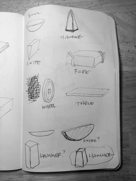 Una vez que comencé a repensar las ideas detrás de la primera versión, me di cuenta de que quería ampliar una escultura en una serie pequeña, porque tenía muchas ideas acerca de las diferentes relaciones entre los materiales para expresar en un solo... Y estas relaciones diferentes a diferentes herramientas primitivas que amplían nuestro alcance en el mundo material como herramientas de fabricación, transporte y comunidad.