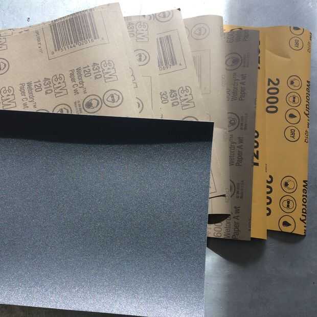 Lija usar la lijadora de disco y Amoladora neumática hasta que las superficies eran suaves y regulares, a continuación, utilizan papel de lija arena 80-2000 a mano y utilizando bloques de lijado para obtener el acabado que quería antes de ir a la rueda que pulimenta.