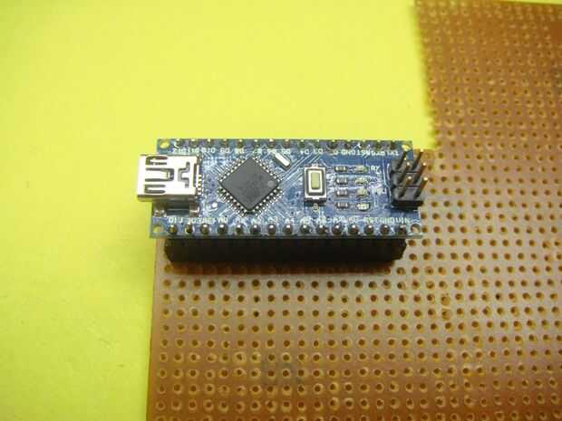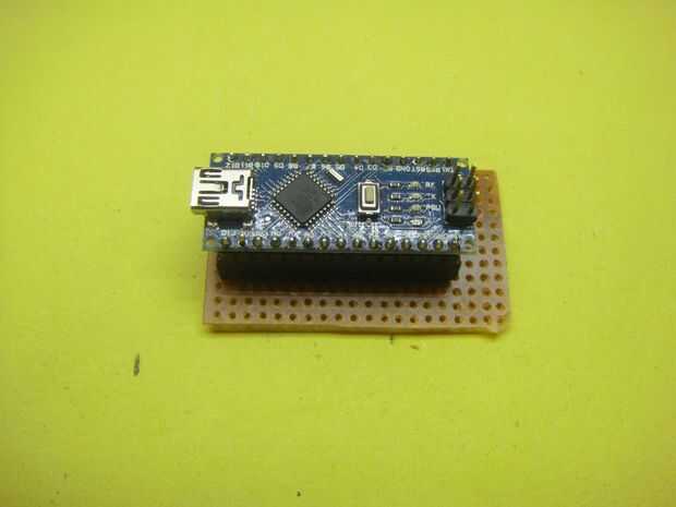 Estoy utilizando arduino nano como el segundo microcontrolador ya Consejo utilizar arduino nano o arduino Pro mini debido a su tamaño. El microcontrolador dos arriba son protoboard amable pero colocando una placa en su palma no es una buena idea ya que es demasiado grande. Así que decidí hacer un escudo simple para mi nano. Tenía la opción de utilizar un escudo preparado pero también son demasiado grandes para ser colocado sobre la palma. Así que la mejor opción estaría haciendo un escudo con Rúbrica femenina y un PCB. Soldar algunos header hembra sobre un trozo de PCB que microcontrolador usted puede caber fácilmente en él. Corte el exceso PCB. Asegúrese de que dejar un poco de espacio en el PCB para el módulo de RF.