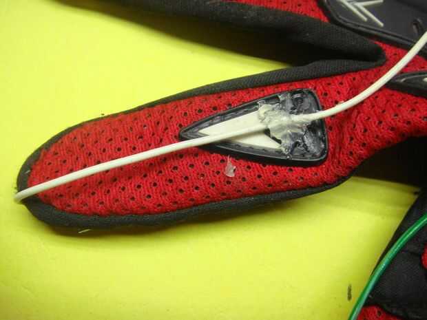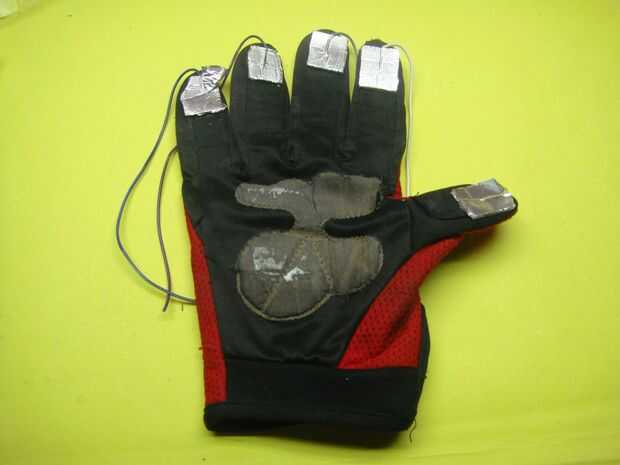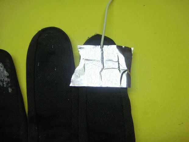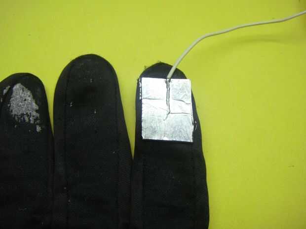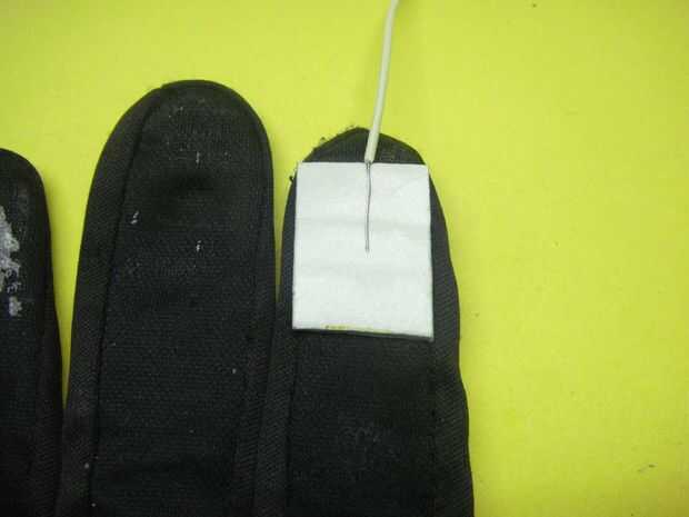 Estos receptores de gesto son como interruptores. El receptor en el pulgar es común. Al tocar el pulgar a cualquiera de los cuatro dedos, le sigue el comando asignado a él. Al tocar el pulgar a cualquier dedo, ellos se cierra el circuito y este comando es enviar a arduino que transmita a linkit quien completa el comando asignado a él. Fabricación de estos receptores es muy fácil. En primer lugar, poner un trozo de cinta de doble cara en un dedo de su guante. Ahora tome un alambre de una cáscara que alrededor de una pulgada. Pele la cinta de doble cara y suavemente ponga el cable en él. Ahora ponga un trozo de papel de aluminio encima de la cinta (Asegúrese de que ese pedazo de papel de aluminio es más grande que la cinta). Corte de la hoja extra a través de tijeras y el receptor de un gesto está listo. Del mismo modo hacen gesto receptores en otros dedos también. Ahora corte el alambre de cada receptor de una longitud suficiente. Aplique pegamento caliente para hacer que el cable permanezca en su lugar.