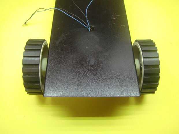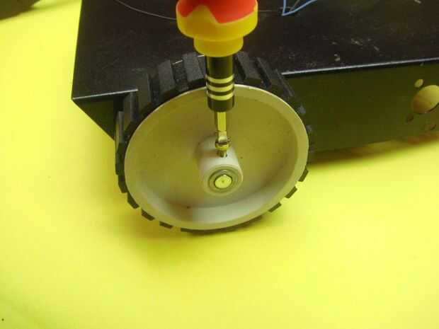 Ya que es un robot con ruedas dos, necesita fijar un mecanismo de eje para girar las ruedas delanteras además de ruedas traseras. Puede utilizar un rodamiento de bolas pero las ruedas se vería mucho mejor y balance de ruedas también es más bueno. Por casualidad el robot entra en una zona donde superficie no es uniforme, entonces las ruedas tendrá más agarre que un rodamiento de bolas. He visto que muchas personas utilizan diferentes tamaños de ruedas. No lo hacen. Disminuirá la eficiencia de tu robot. Conecte su frente y las ruedas y tornillo entonces firmemente.