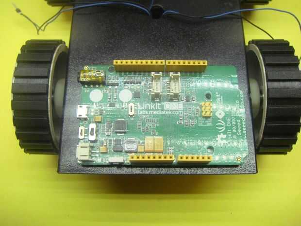 Después de hacer una la infraestructura básica y base del robot, se va a fijar nuestro linkit uno al chasis de nuestro robot. Esto facilitará su trabajo en nuevas medidas. Tome una cinta de doble cara y pegue una parte pequeña en la parte inferior de la un junta linkit. Pelar el otro lado y palo precioso el linkit uno a su chasis.