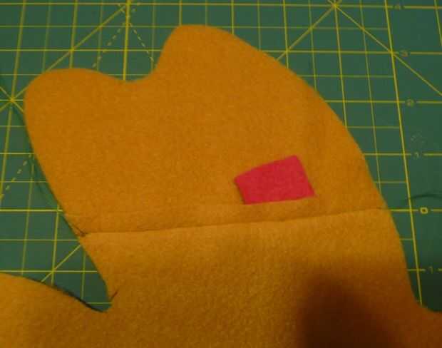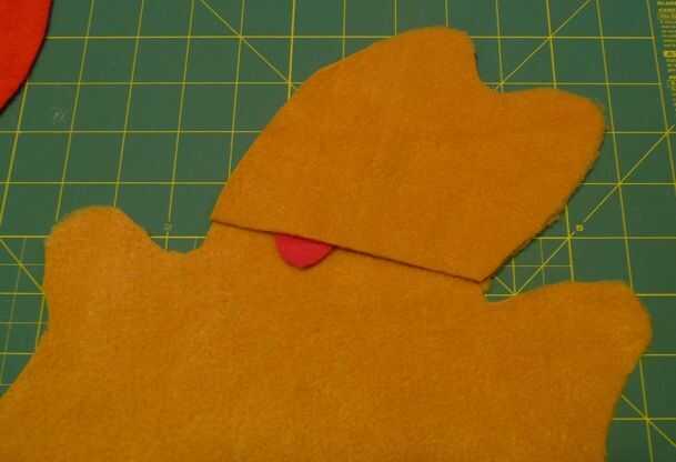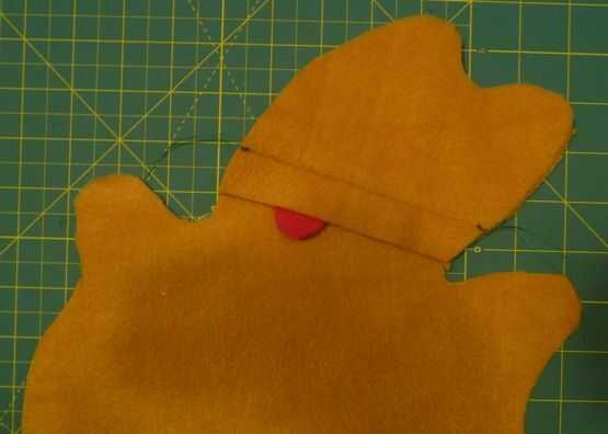 Para el rostro enfermo, queremos que la lengua, el labio superior está sobre la lengua y la lengua es sobre la pieza de cuerpo. Con el cuerpo derecho hacia arriba, coloque el patrón sobre la tela y marcar Dónde está justo al borde de la tela sólo la línea de la boca. Tenemos que asegurarnos de que la lengua queda atrapada debajo de esta línea cuando cose en el. Coloque la lengüeta derecha arriba en el cuerpo, coloca de modo que cae sobre la línea de la boca ha marcado los bordes de hace apenas un segundo. Luego coloque el cabezal de derecha arriba en la parte superior. Va cubriendo más de la lengua que queremos, pero te recorte a tela sobrante después que coser.
