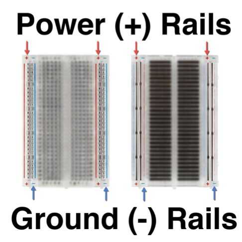 Placa de protoboard A es una herramienta para rápidamente y fácilmente circuitos edificio. Carriles de las columnas exteriores se llaman rieles. Hay energía y carriles de tierra que se utilizan para la conexión de alimentación (voltaje) y de tierra a la placa. Note cómo los carriles están conectados, esto significa que se puede conectar en cualquier lugar en el carril que conecte a la corriente.